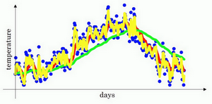 所以这是一个加和并平均,100号数据,也就是当日温度。我们分析的组成,也就是在一年第100天计算的数据,但是这个是总和,包括100号数据,99号数据,97号数据等等。画图的一个办法是,假设我们有一些日期的温度,所以这是数据,这是,所以100号数据有个数值,99号数据有个数值,98号数据等等,为100,99,98等等,这就是数日的温度数值。