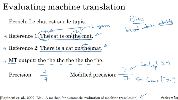 假如给你一个法语句子:Le chat est sur le tapis,然后给你一个这个句子的人工翻译作参考:The cat is on the mat。不过有多种相当不错的翻译。所以一个不同的人,也许会将其翻译为:There is a cat on the mat,同时,实际上这两个都是很好的,都准确地翻译了这个法语句子。BLEU得分做的就是,给定一个机器生成的翻译,它能够自动地计算一个分数来衡量机器翻译的好坏。直觉告诉我们,只要这个机器生成的翻译与任何一个人工翻译的结果足够接近,那么它就会得到一个高的BLEU分数。顺便提一下BLEU代表bilingual evaluation understudy (双语评估替补)。在戏剧界,侯补演员(understudy)学习资深的演员的角色,这样在必要的时候,他们就能够接替这些资深演员。而BLEU的初衷是相对于请评估员(ask human evaluators),人工评估机器翻译系统(the machine translation system),BLEU得分就相当于一个侯补者,它可以代替人类来评估机器翻译的每一个输出结果。BLEU得分是由Kishore Papineni, Salim Roukos,Todd Ward和Wei-Jing Zhu发表的这篇论文十分有影响力并且实际上也是一篇很好读的文章。所以如果有时间的话,我推荐你读一下。BLEU得分背后的理念是观察机器生成的翻译,然后看生成的词是否出现在少一个人工翻译参考之中。因此这些人工翻译的参考会包含在开发集或是测试集中。